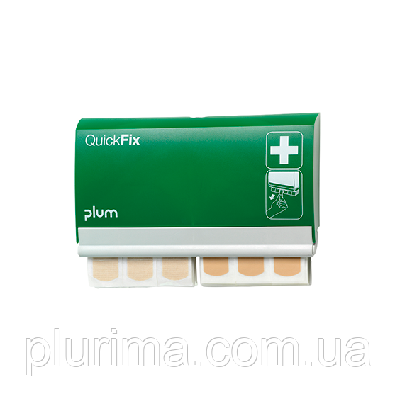 Якщо виробничі процеси на вашому підприємстві протікають як у звичайних умовах, так і за підвищеної вологості, рекомендуємо зручний роздавач QuickFix, укомплектований двома змінними касетами з різними типами виробів. Заявляючи цей товар, ви отримуєте диспенсер, з якого можна витягти еластичні або водостійкі пластирі за потребою. Зверніть увагу, що сам роздавач повністю універсальний, його можна використовувати для всіх різновидів пластирів від данського концерну Plum.